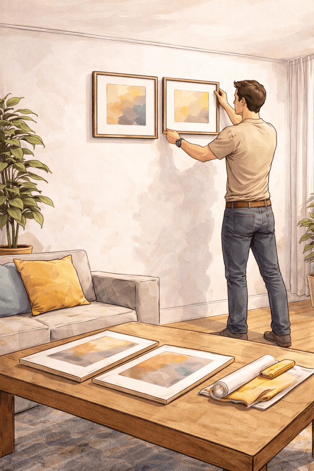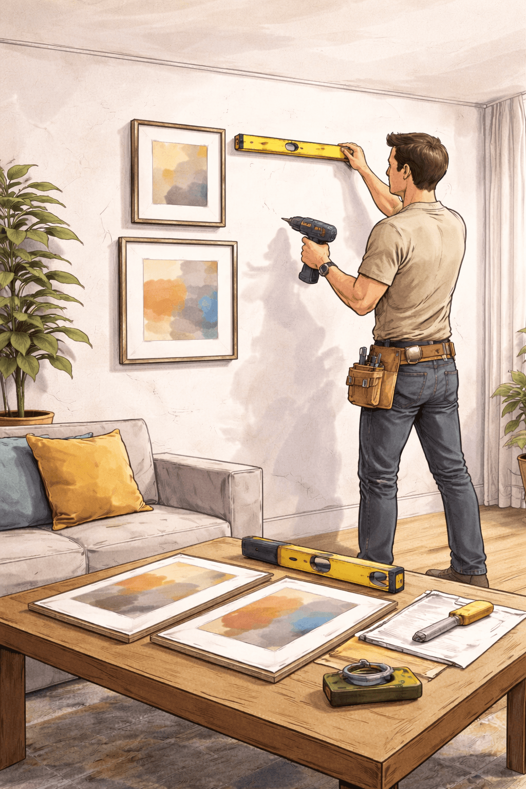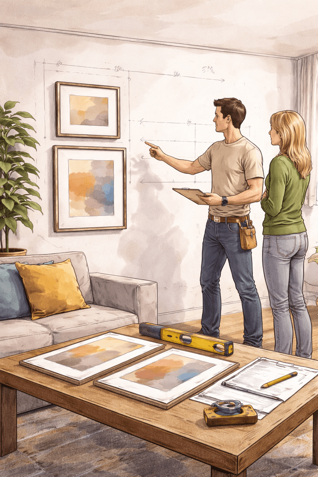 We look at your wall and your artwork. We check size, weight, and placement. We agree the position before anything goes up.